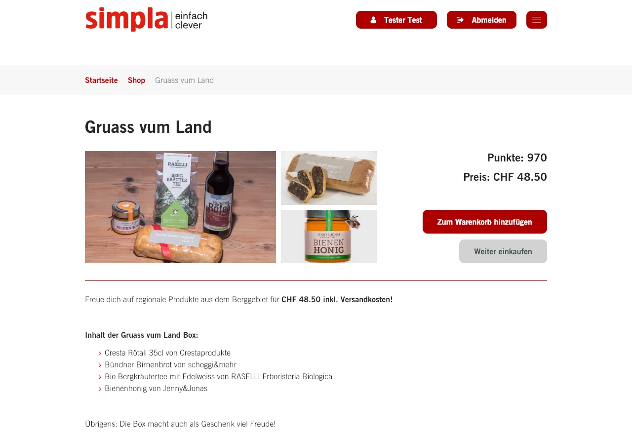 Users on the Simpla platform can also redeem the existing points in the shop. For the individual items, both the price in CHF and the points to be redeemed are indicated.